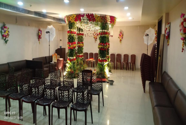 Hall 1 can accommodate 80 - 150 guest(s) Veg Menu starting price of Hall 1 is Rs. 550 per plate. and Non Veg Menu starting price of Hall 1 is Rs. 650 per plate.