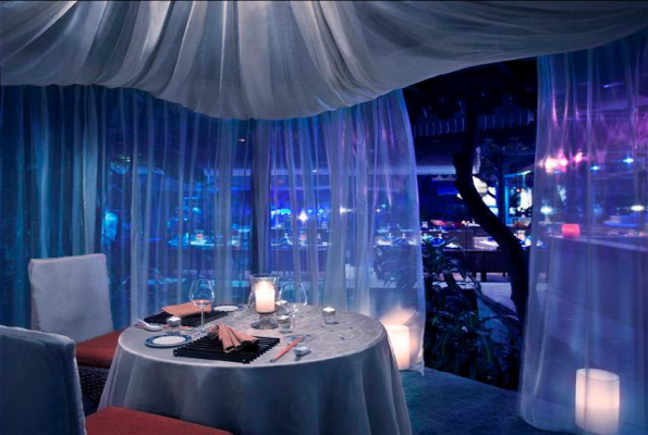 Mood lighting by internationally renowned designer Tony Corbett ensures that the ambiance is perfect, as do specially designed fibre chairs, leather ottomans, dark silk textile and natural stone tables. Solid teak floors and Southeast Asian tiles complete the look.
