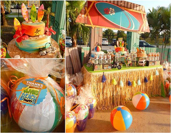 Serve up delicious beach-inspired snacks and drinks, such as Lunchables snacks, A big pitcher of tropical punch, Melon balls, Puffed cheese balls and whale crackers in beach buckets, Ocean blue gelatin cups with Swedish fish swimming inside, Pink lemonade cupcakes in ice cream cones. Try keeping your little beach-goers hydrated with a fun hydration station featuring Snow cones with homemade sno-cone syrup, Homemade popsicles.