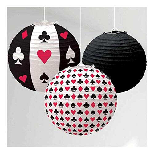 To Buy Click HereUp the ante with these Casino Paper Lanterns! These hanging decorations include two lanterns covered in playing card suits and a third lantern in solid black. These easy-to-assemble paper lanterns pop open into perfect spheres and are supported by durable metal frames. Use the included strings to hang them from the ceiling or door frame for a winning party atmosphere at your casino night or Vegas party!