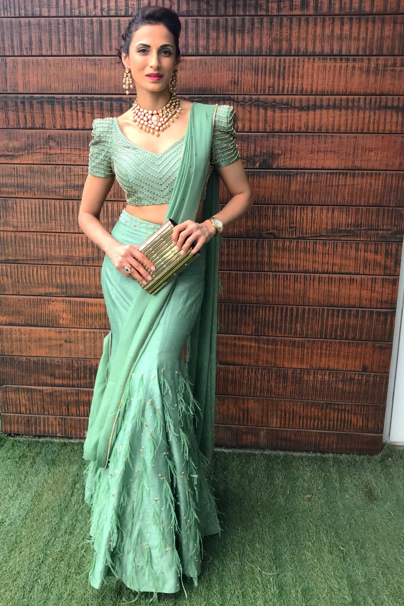 This is also known as the mermaid style of draping saree. This style helps flaunt your figure in a very elegant and sensual manner. The best saree fabric for a fish cut draping style are chiffon and georgette.