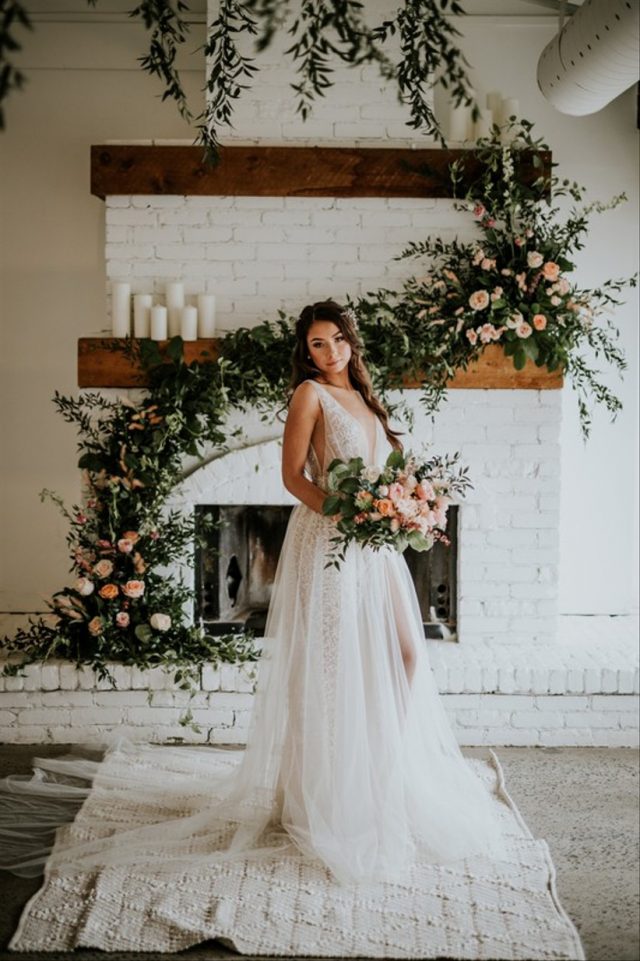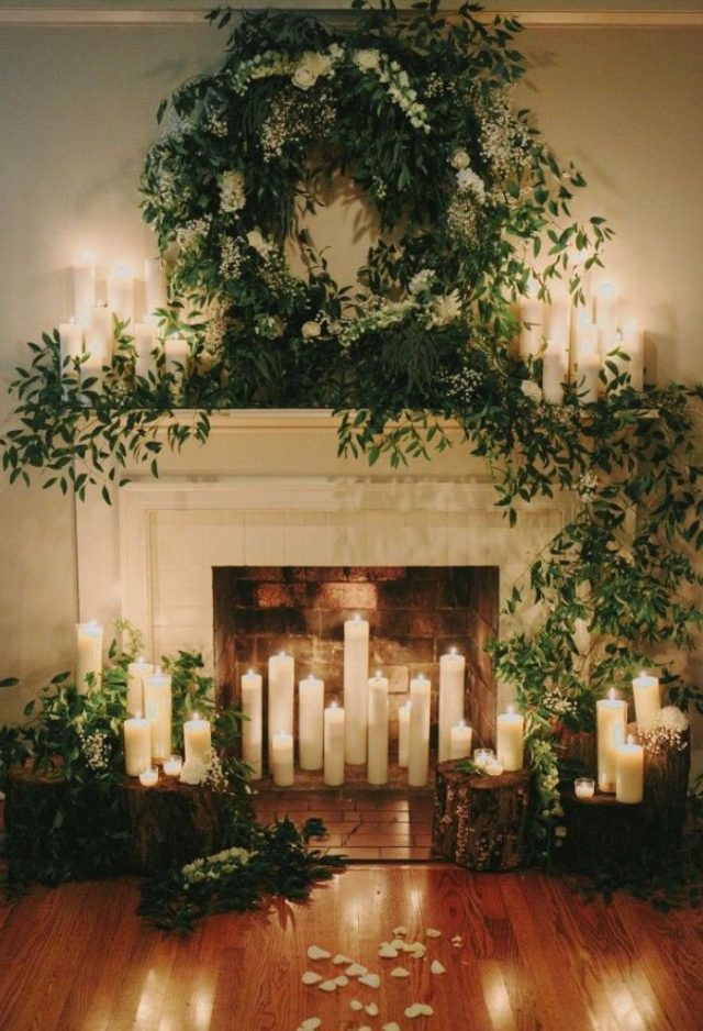 1. Lush Fireplace Wedding Backdrop