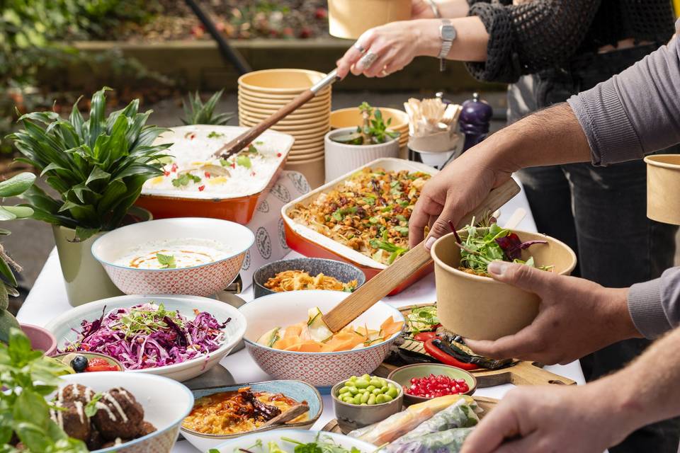 Make your event inclusive with separate food counters for vegan and gluten-intolerant guests, featuring dishes like jackfruit biryani, almond milk payasam, and bajra roti tacos.