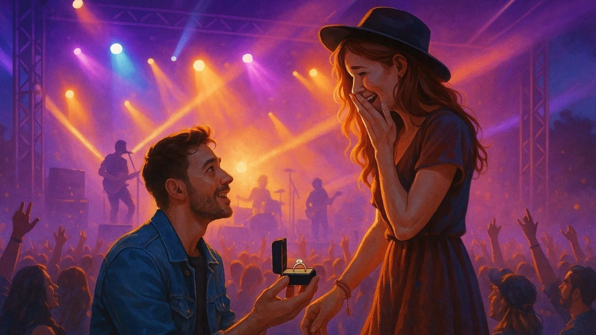 If she’s passionate about music, propose at a concert of her favourite band. You could hold up a sign, get the crowd to cheer, or ask the organisers for a short shoutout. The energy of the crowd and the music will make it euphoric.