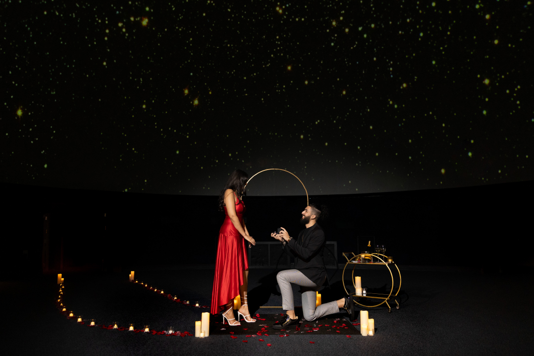For couples who love quiet, soulful experiences, a stargazing proposal is a dream. Set up a cozy space with blankets, pillows, and warm drinks at a scenic spot or even your terrace. Rent or borrow a telescope and show her constellations, then surprise her with the ring under a sky full of stars. You can even personalise it with a star map of the night you met.