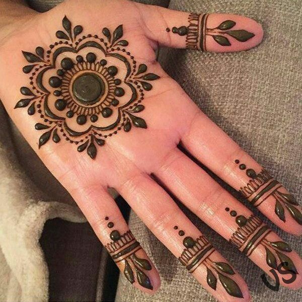 P.C.- Arabmehendi.comIntricate intricacies adorn the mandala in the center, which discreetly connect the design to the patterns traced on the finger. This design provides an example of expression through the use of simple geometric forms and a little amount of detailing!