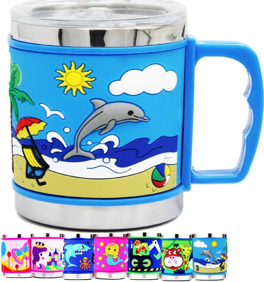 These are double-walled stainless steel mugs. These mugs come in different cartoon graphics on these children's cups and they look extremely adorable. The mugs come with a silicone design on the outside to protect your child's hands. Smooth, rounded edges on the mugs ensure that your child is not harmed. It is sealed with a lid to prevent leakage.