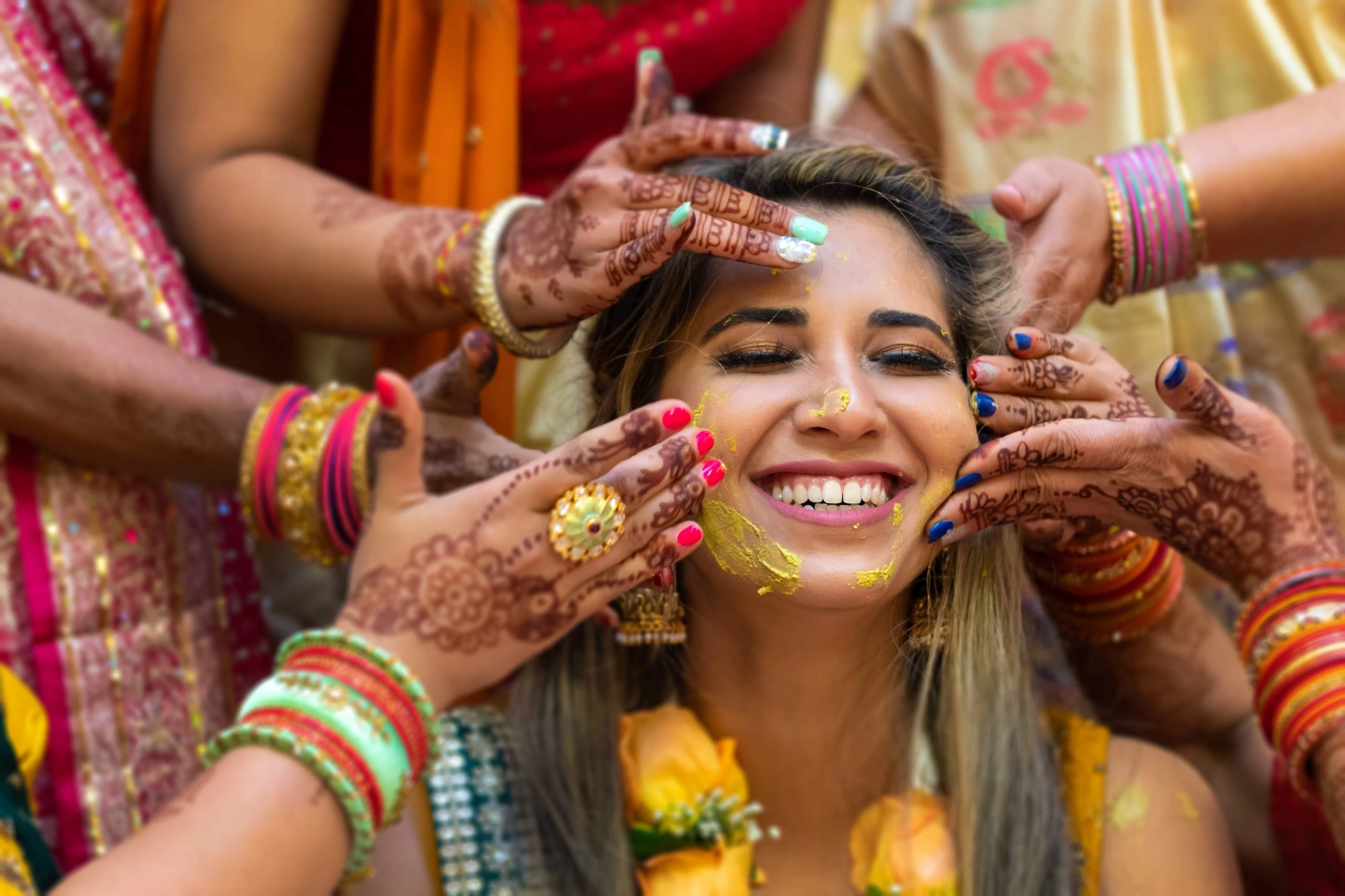 The beautiful ladies around the bride / groom, all smeared in yellow colour makes the ambience vibrant and is a perfect picturesque moment!