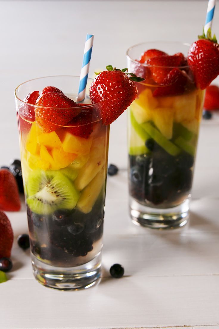 - In tall glasses, layer blackberries, blueberries, kiwis, pineapple, mango, and strawberries.