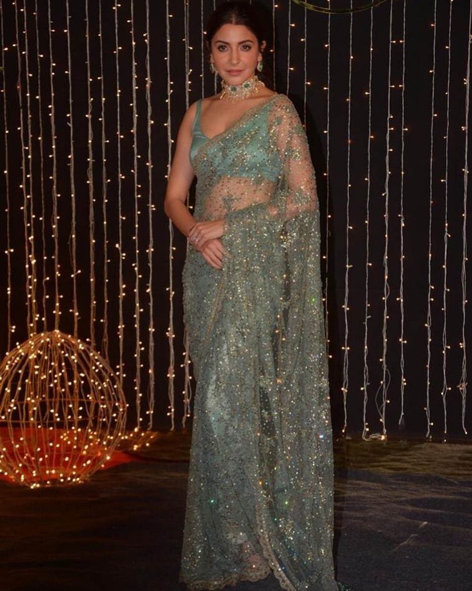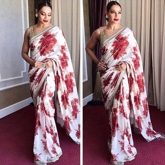 Pink has always been a popular colour among celebrities and goes well with the Indian skin complexion. It looks elegant and can be worn for a small get together party or even for a wedding party. When paired with a shiny black blouse, a pink saree is perfect for a fancy dinner party and gives a feminine look. Mouni Roy in a tie-dye summer saree with an asymmetrical hem drape paired with a light golden bikini blouse is an absolute head turner for summer parties..