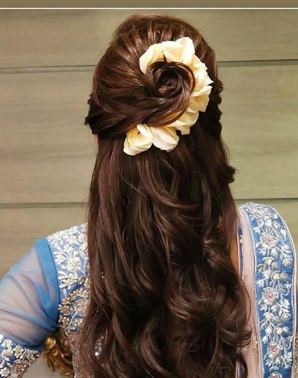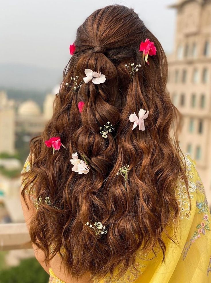 - Flower Bun in Loose Hair: Ideal for curly or wavy hair types, this style lets a few strands gently frame the face, adding a soft, romantic vibe.