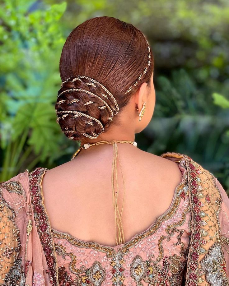 - Traditional South Indian Braids: Inspired by traditional South Indian bridal hairstyles, multiple braids adorned with temple jewelry or gold accessories create a look of majestic beauty.