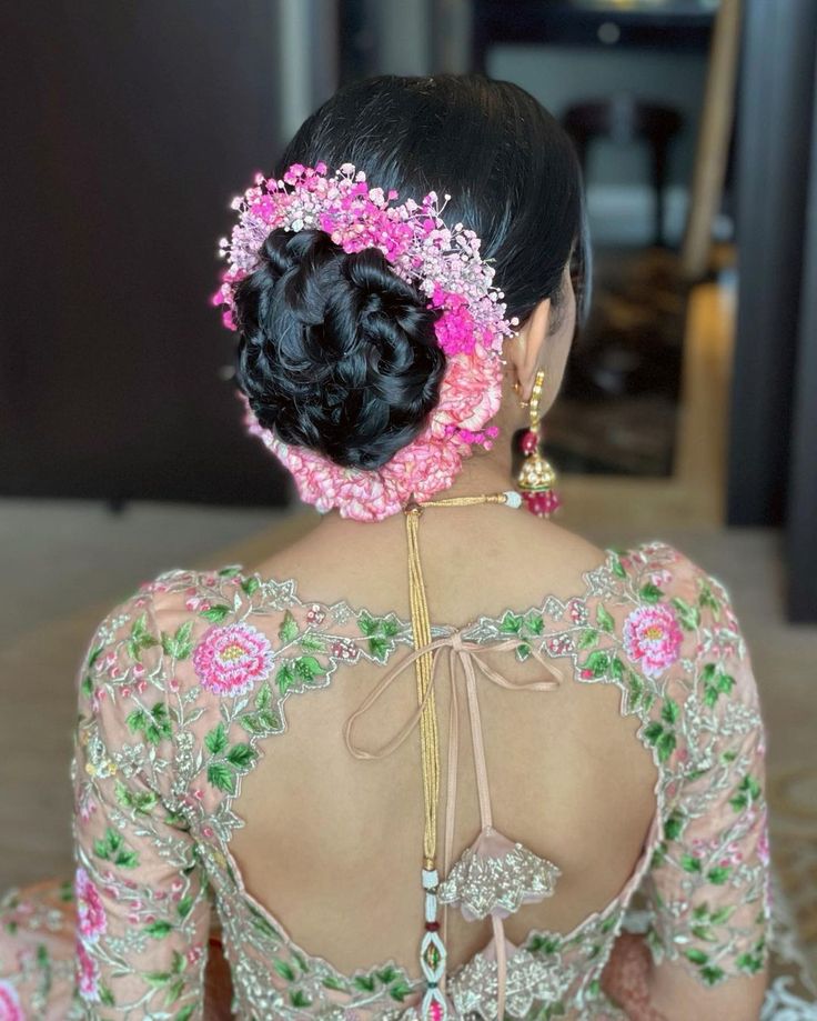Elevating the simple bun to a piece of art, floral and jewelled accents introduce a touch of glamour and sophistication. Options range from the bouquet bun with crown gajra and jewelled net to more minimalistic designs, each adding a unique charm.