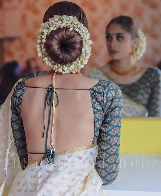 - Floral Bun: Crafted to resemble a flower and adorned with multi-shaded flowers, this style is particularly suited for red Kanchipuram sarees, adding a vibrant burst of color.