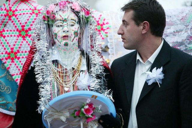 Bulgarian brides' faces are painted white and are decorated with sequins as per their wedding customs. This practice is one of the wedding festivities that survived the communist regime. Wedding festivities last for five days and include lots of singing and dancing.