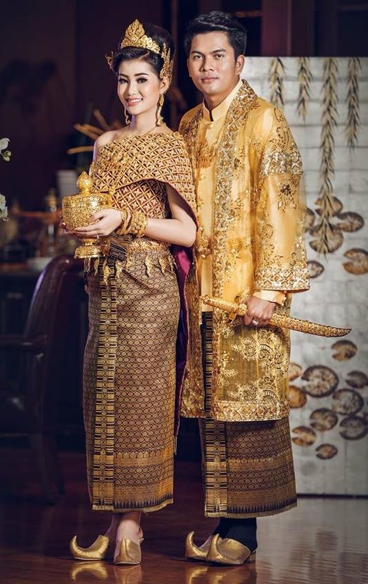 The wedding attire in Cambodia is unique as Sampot is Cambodia's national dress. The bride and groom wear different, yet colour co-ordinated outfits for various wedding ceremonies, finally culminating in an opulent all-gold silk outfit to represent the couple being treated like royalty.