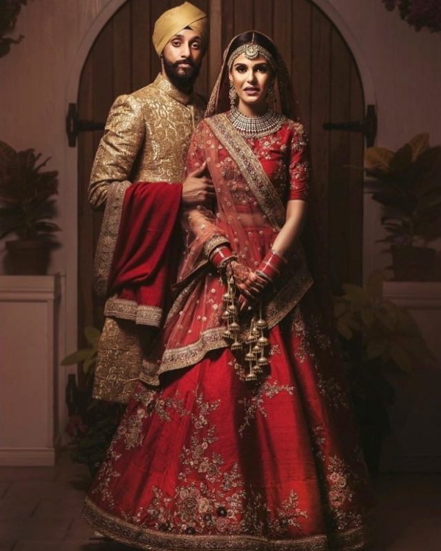 The Indian wedding outfit, no doubt, changes as per the region in the country. The Brides from North India wear an elaborate outfit on their wedding day that is called Lehenga-choli. It is a combination of a short blouse, a billowing skirt, and a headscarf that is extravagantly decorated with embroidery and brocade. Brides in India generally choose the shade of reds and pinks for their wedding dresses, as red colour is considered to be the most auspicious colour among Hindus and also symbolizes happiness and good luck. In some regions, brides wear a red wedding saree / sari or suit.