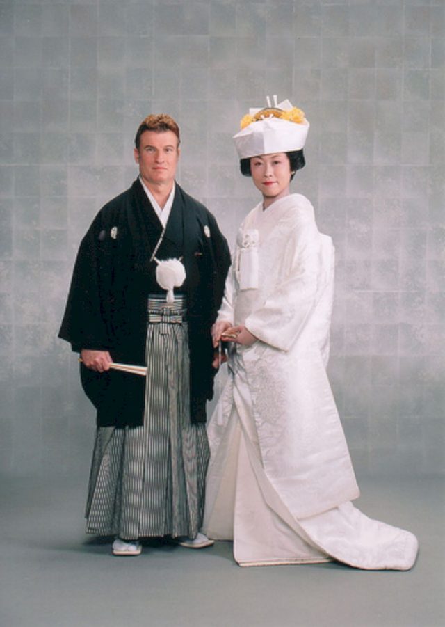 At a traditional Japanese wedding, the bride and groom usually wear Japanese wedding kimonos. The bride wears a white wedding kimono called "uchikake" with a white headdress. The white wedding gown symbolizes purity and maidenhood. After the ceremony, the bride may then change into a red kimono to symbolize good luck. Brides also cover their faces in white with a powder known as Oshiroi. They even cover their head with a circular headdress called tsunokakushi that is made from a stiffened fabric.