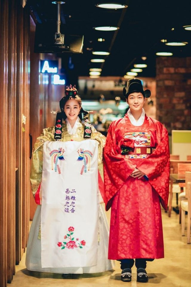 Brides from Korea wear a Jeogori, it is a short jacket with long sleeves with two long ribbons that are tied together to form an otgoreum and chima which is of full length, wrap-around, high waist skirt. Tied to the skirt or the ribbon on their jacket is a Hanbok decoration that is called thenorigae, which is a centuries-old tradition. Their wedding gowns are made up of simple lines, without pockets and vibrant colours.