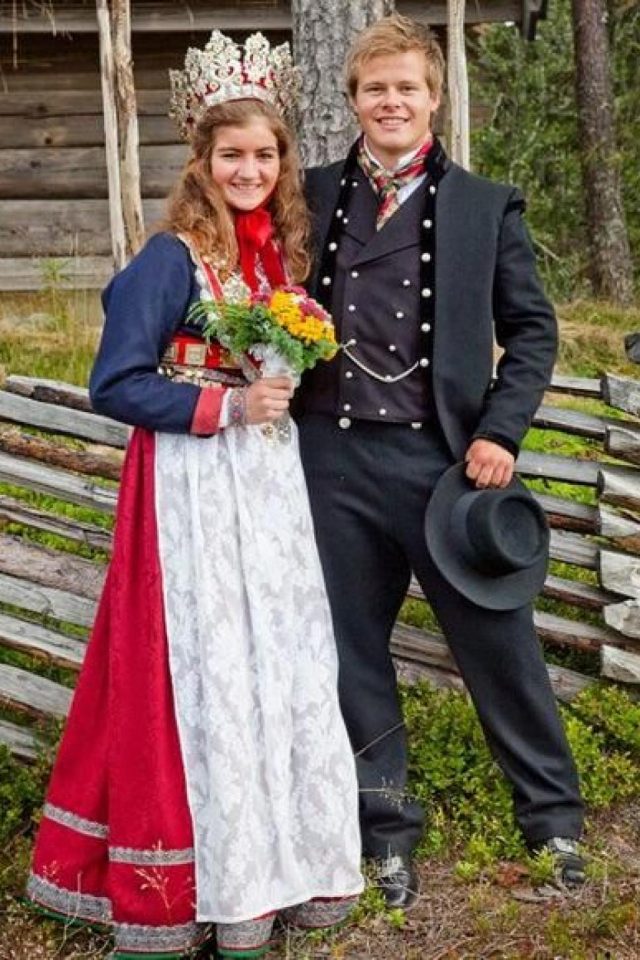 Norwegian bridal attire is usually in tones of white and silver . The look is completed with a crown made up of silver or red with gold and will include a circle with tiny spoon-shaped bangles creating a melodic chiming each time the bride moves her head. Norwegian weddings today look similar to those of the U.S. and other European countries. The typical bride wears a long white dress and her groom will have a black tuxedo on.