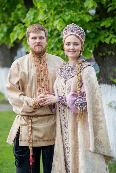 Weddings in Old Russia used to be very colourful, with red being their popular choice. But contemporary Russian bridal wear has a lot of European influences. One distinctive feature to be noted is their crown which is placed on both the bride and the groom's head by the priest during their wedding ceremony in Church. The bride's dress is usually made from white fabric, as it is considered the colour of joy and the symbol of purity and chastity. Brides may wear a veil, a crown of gold, or pieces of fabric, satin, or taffeta in their hair.
