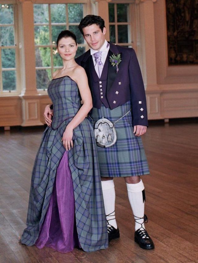The use of highland dress and the kilt, jacket, dirk and sporran in Scottish weddings has continued over the centuries, whilst the Scottish bride's white gown and veil has its roots in more modern times. She might wear a horseshoe on her arm for good luck, or a pageboy might deliver one to her as she arrives at the ceremony. After the wedding ceremony, the bride wears a shawl emblazoned with her new husband's clan colours to signify her transition into his family.