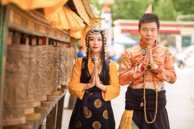 The bride traditionally wears a nice Tibetan traditional wedding dress, jewellery and a special jewel that hangs from her forehead. The wedding dress is usually white in colour and is made up of woollen fabric. The bridal dress is heavily and beautifully layered with aprons and robes of bright colours and elegant embellishment. The dress is covered with layers so much so that it can be hard to spot the white dress beneath.