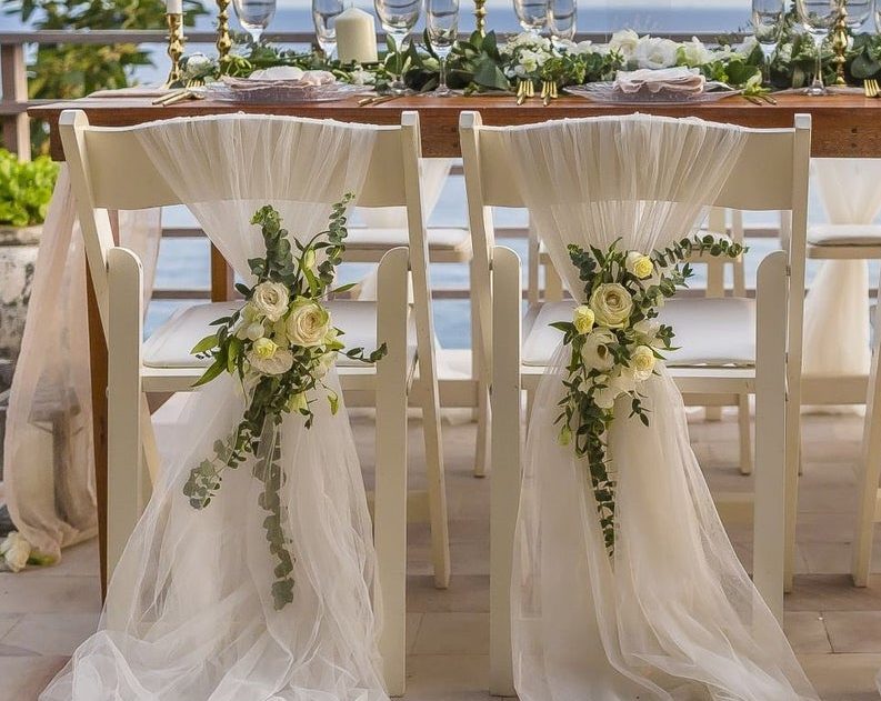 Elevate the elegance of your ceremony with beautiful chair sashes. These decorative fabric pieces can be tied around the chairs to add a touch of style and sophistication. Choose sashes in colors that complement your wedding theme and consider adding greenery or floral accents for an extra touch of charm.