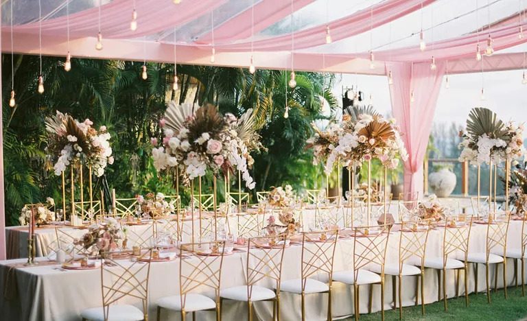 Create a luxurious and glamorous atmosphere with hot pink velvet chairs. These statement pieces add a vibrant and opulent touch to your reception tables. Pair them with matching floral arrangements for a cohesive and visually striking look that will leave your guests in awe.
