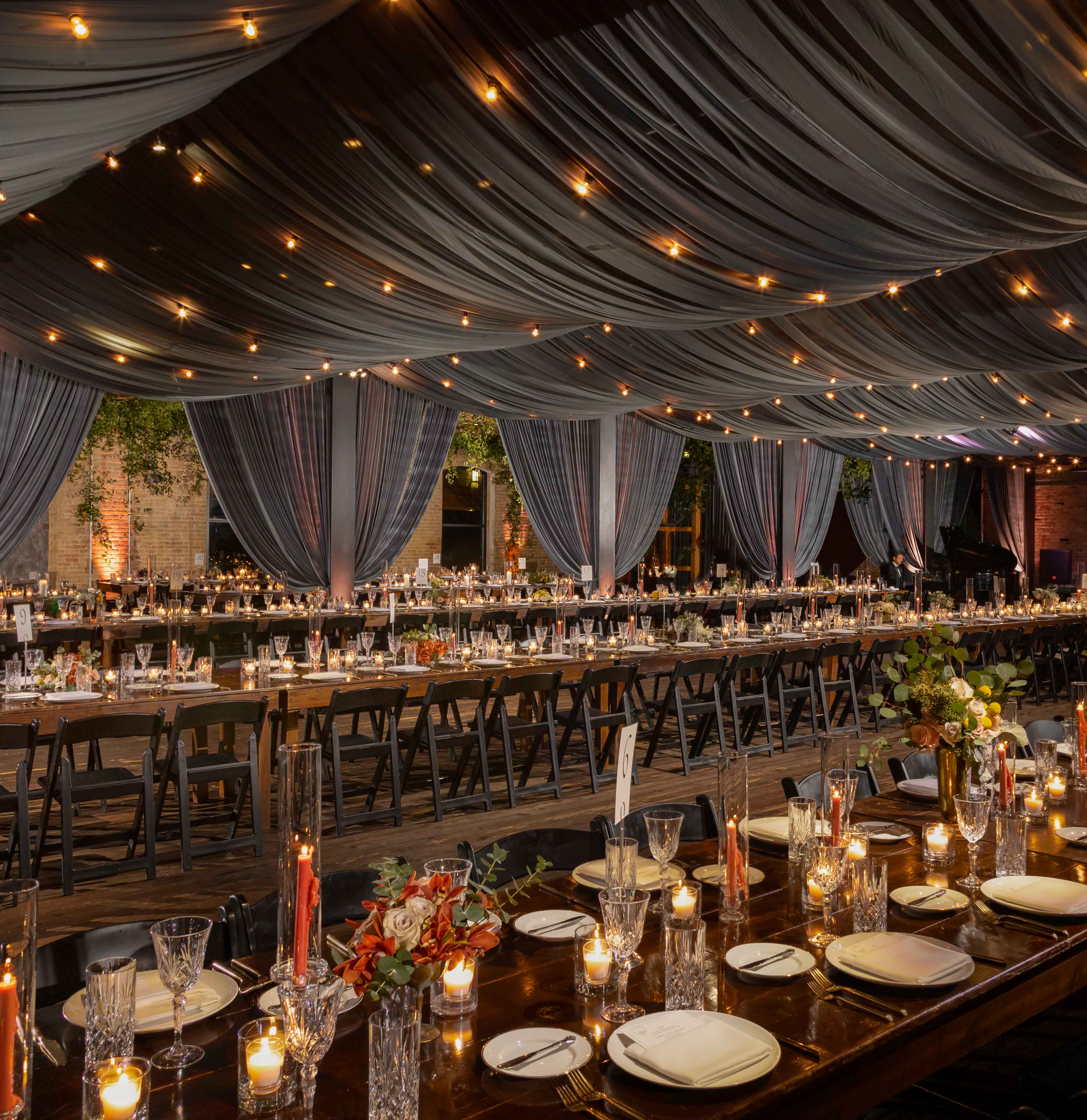 Set the mood with dramatic draping and uplighting. Create a romantic and intimate atmosphere by using flowing fabric and warm lighting to transform your reception space. This combination of textures and colors adds depth and dimension to your décor and creates a captivating and enchanting ambiance.