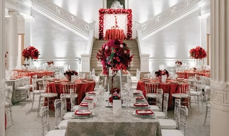 Elevate the elegance of your reception with a color palette of gray and pops of red. Use gray as the anchor color, and incorporate red accents throughout the design. From linens to floral arrangements, these bold and contrasting colors add a sense of drama and sophistication to your reception.