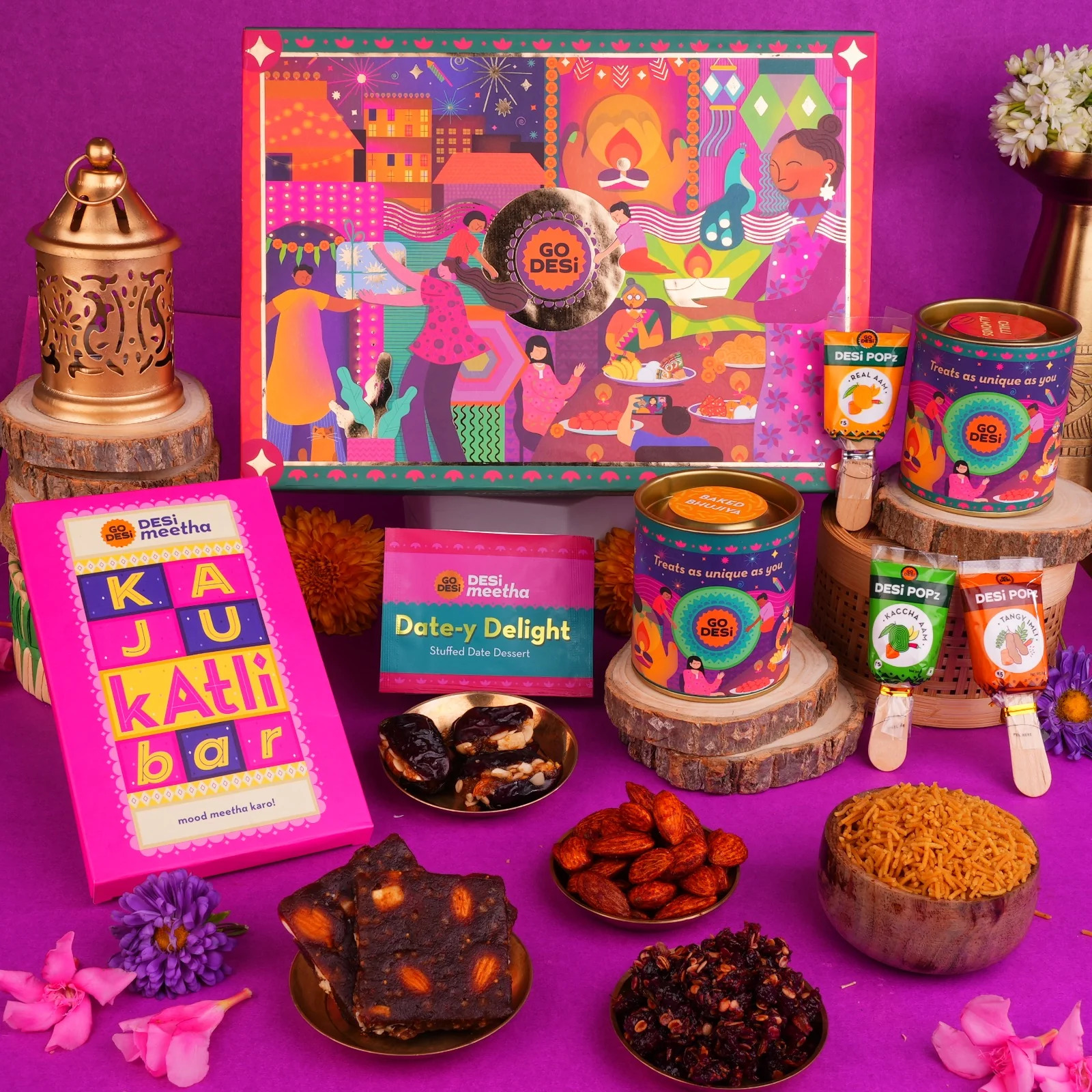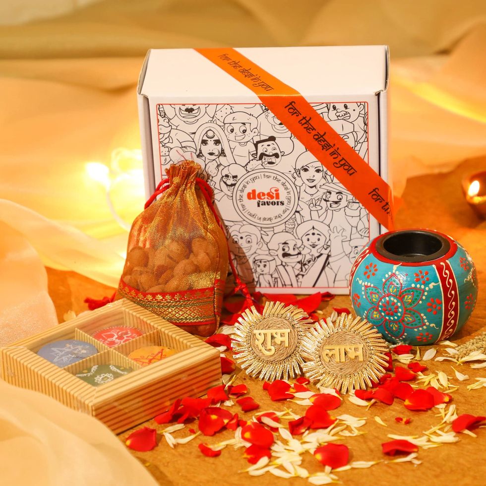 A Desi Favors Diwali gift box is filled with traditional items associated with the festival. It's a comprehensive gift that captures the essence of Diwali, making it a perfect present for anyone celebrating the festival.