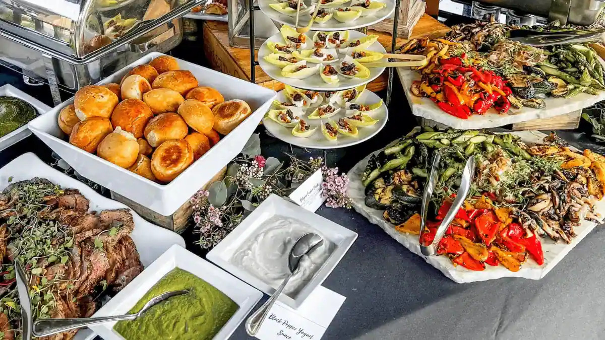 Work with caterers who focus on local, sustainable, and seasonal cuisine. Also, consider serving a vegetarian or vegan menu, as plant-based meals consume fewer resources to produce.