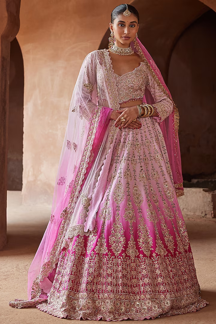 - Subtle Ombre Lehenga: Choose a lehenga with a subtle ombre effect for a soft and romantic look. Shades like blush pink merging into ivory or pastel blue transitioning into white create a dreamy and ethereal aesthetic that is perfect for a fairytale wedding.