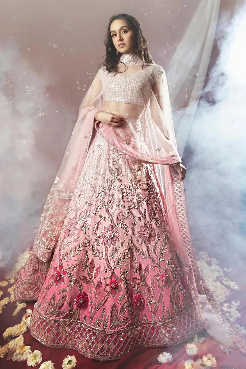 - Blush Pink and Ivory Lehenga: This ombre lehenga in blush pink and ivory is a dreamy choice for the roka function. The soft and delicate colors create a romantic look, and the intricate embroidery adds a touch of glamour.