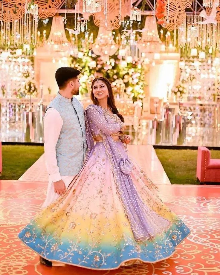 - Vibrant Ombre Lehenga: Opt for a vibrant ombre lehenga in shades of orange, yellow, and pink for your mehendi ceremony. The bright colors will complement the festive atmosphere and make you the center of attention.