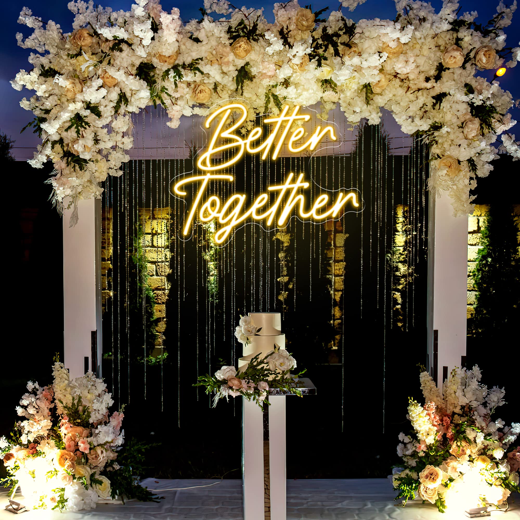 Modern décor trends focus on bold statement walls. Floral arches paired with neon signs featuring your names or proposal date add personality.