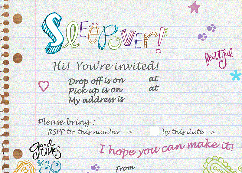 Source: Pinterest1week before the D-date, send out the invitations for the sleepover party. You can choose to send printed invitations or paperless e-invitations for the same. Include the details like Date, Start Time (drop-off time), End Time (pick-up time), indicate the theme, if any. And consider adding an interesting tag line like ‘come in your pajamas with your toothbrush’, ‘let's have a rock n’ roll night’, ‘movies, cards, games, and dancing await you...