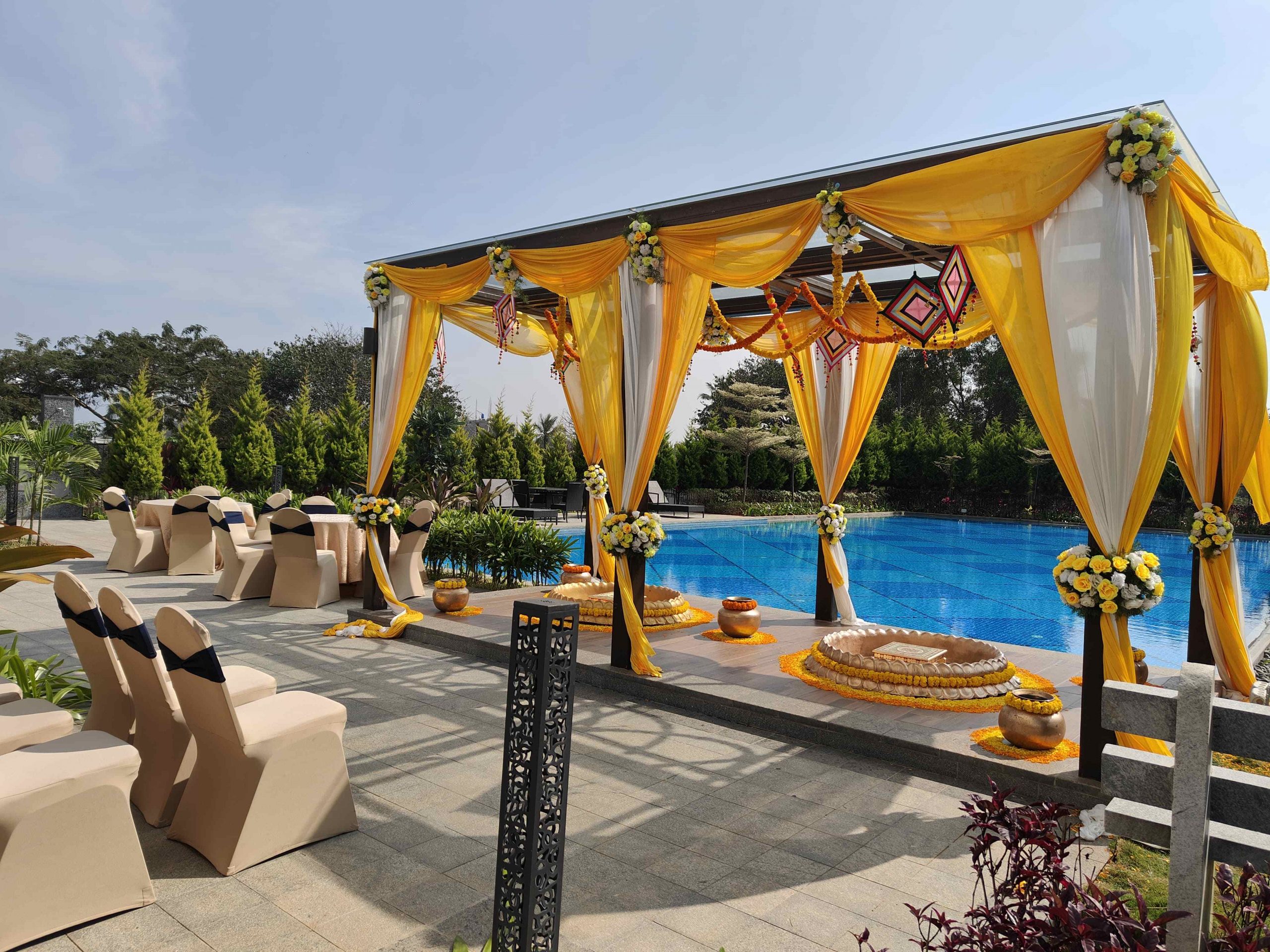 Palm Meadows Resort, located in the upscale area of Whitefield, is a luxurious venue that offers a perfect blend of elegance and tranquility. Surrounded by lush greenery and equipped with world-class facilities, it is an ideal choice for weddings, corporate events, and private celebrations. The resort features versatile indoor and outdoor spaces, a serene ambiance, and impeccable services that ensure your event is truly special. With its sophisticated architecture, premium amenities, and a dedicated team to cater to your needs, Palm Meadows Resort promises a seamless and memorable experience for you and your guests.