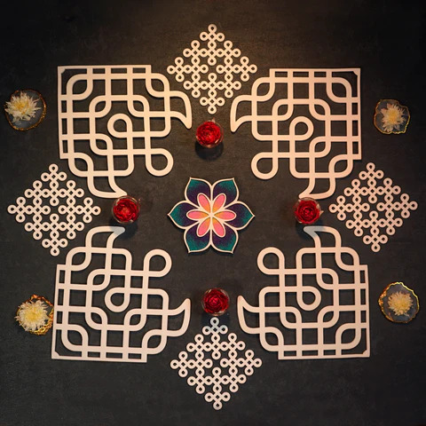 Kolams are intricate designs made with rice flour at the entrance of homes. These patterns are not only decorative but also symbolic of welcoming Lakshmi, the Goddess of Wealth, and warding off evil spirits. The practice of creating kolams is a cherished tradition passed down through generations.