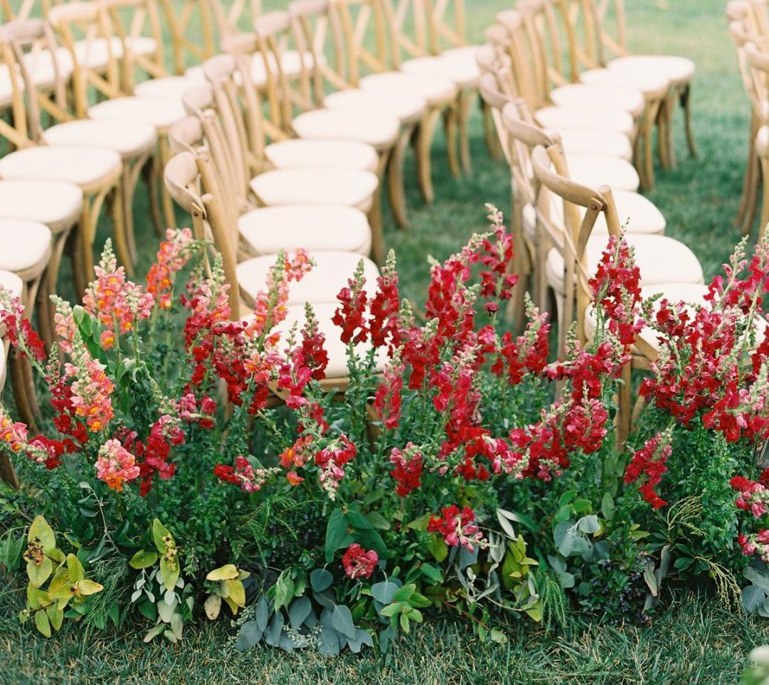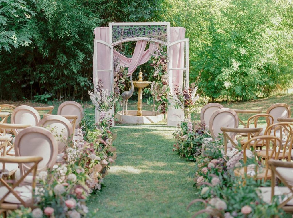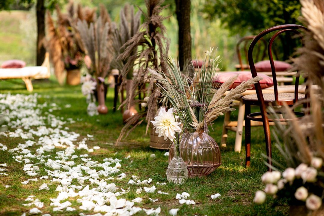 One of the most recently popular wedding décor trends has to be pampas grass. So go for this versatile element to give your wedding aisle a modern feel. The best thing is that it’s available all year round! It adds a beautiful soft boho touch but it can work with any color, theme and style. Whether you’re going for small details or larger statement backdrops, it’s a perfect wedding aisle décor idea.