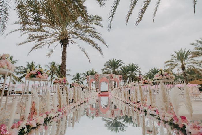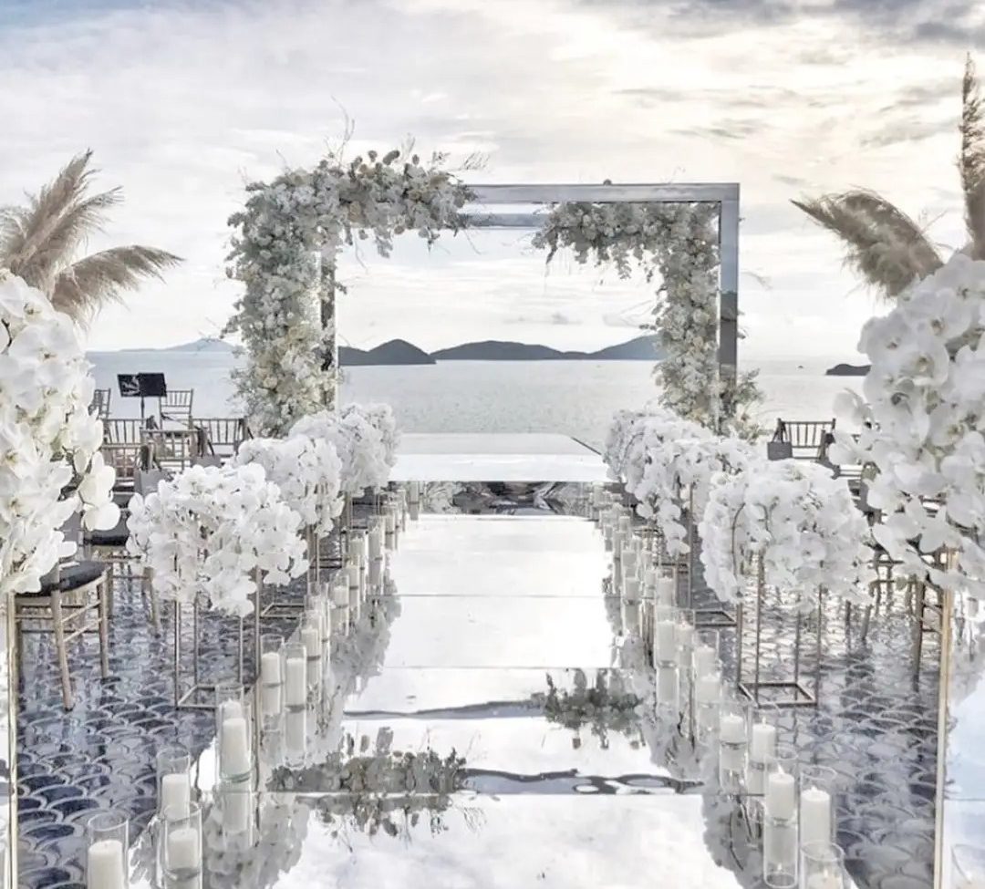 Mirror aisles are a modern trend that adds a dreamy and elegant feel to your wedding ceremony. They not only make your venue appear larger by reflecting light but also create an illusion of walking on water.