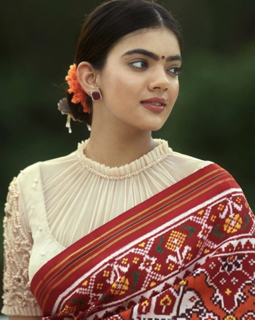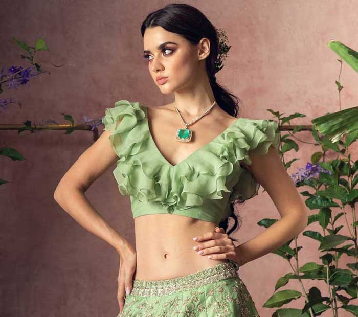 The most popular design choice for 2022 is the frill blouse, which is also one of the designer blouse patterns liked by many. For an event especially wedding, a blouse neckline with frills is always the finest choice to pair with any kind of saree or lehenga. Brides choose this blouse neck style for sarees that are plain or patterned. Brides can show their style by combining it with their choice of straightforward diamond earrings. This is a completely different way to dress especially for a bride.