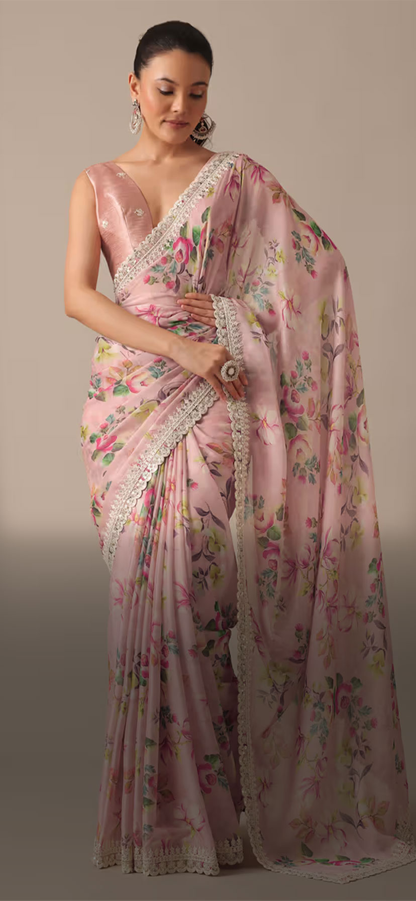 If you love a soft and feminine vibe, floral sarees are perfect for farewell parties. They feel playful yet elegant and look amazing in pictures, especially for day events. Floral prints are also great for those who want a stylish look without going too heavy on embroidery or shimmer.