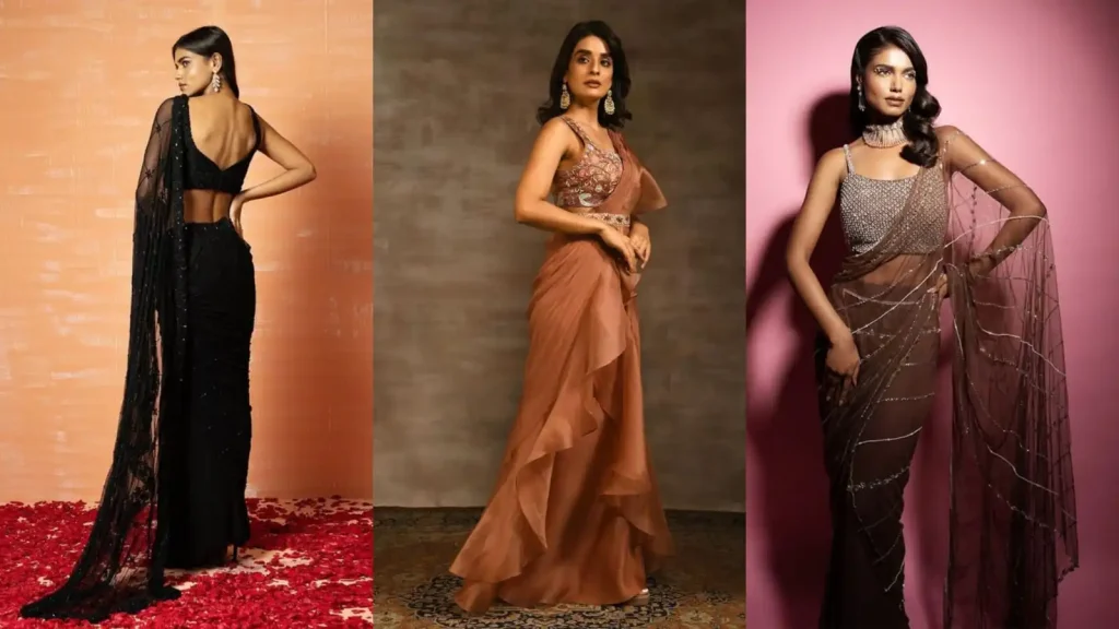 Sometimes, the saree is simple, but the blouse becomes the highlight. Statement blouses are a major trend for farewells because they add personality to your look. Think corset blouses, deep necklines, puff sleeves, backless designs, halter necks, or even metallic blouses paired with plain sarees.