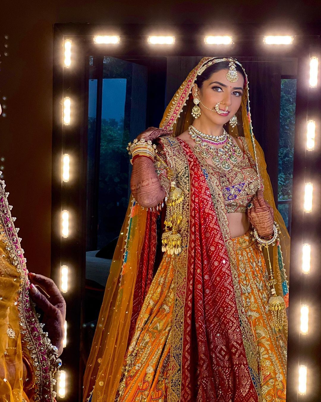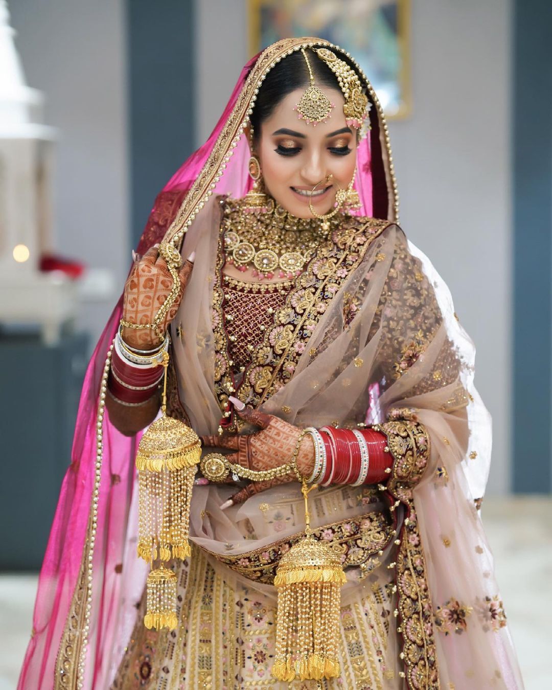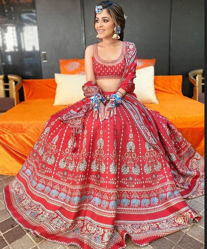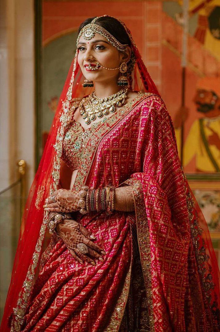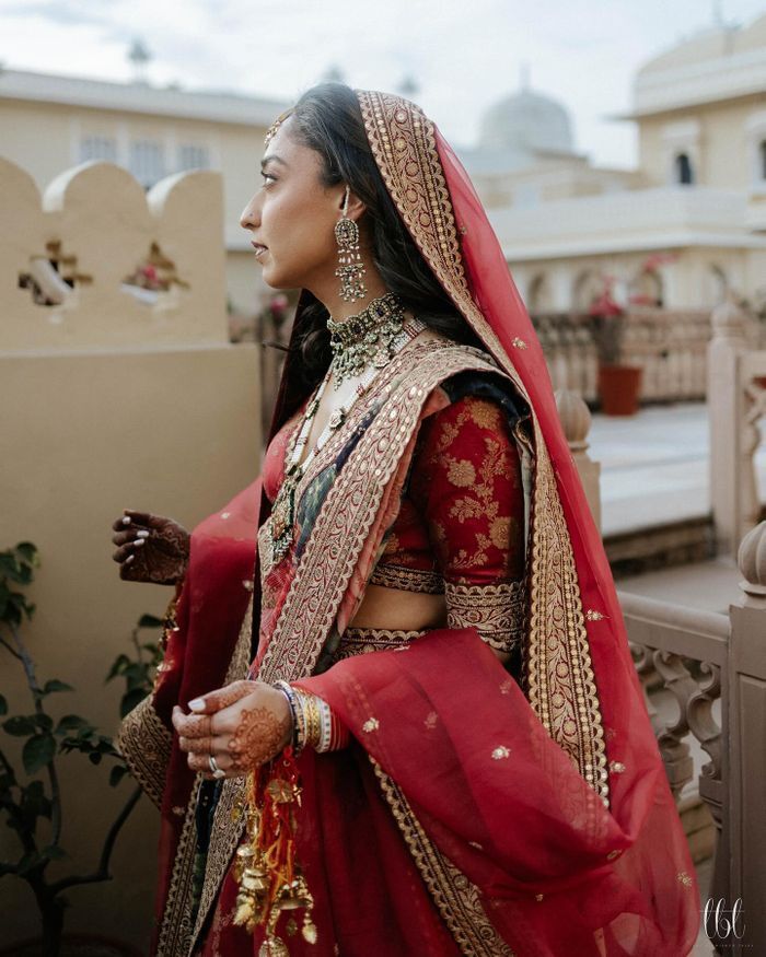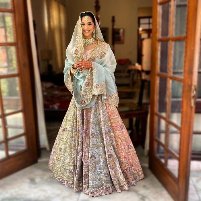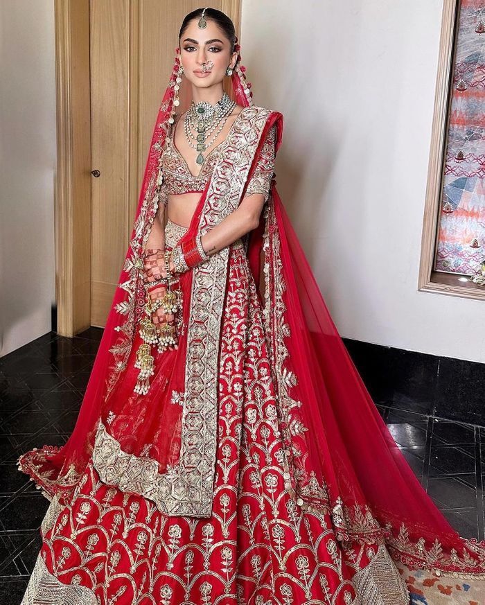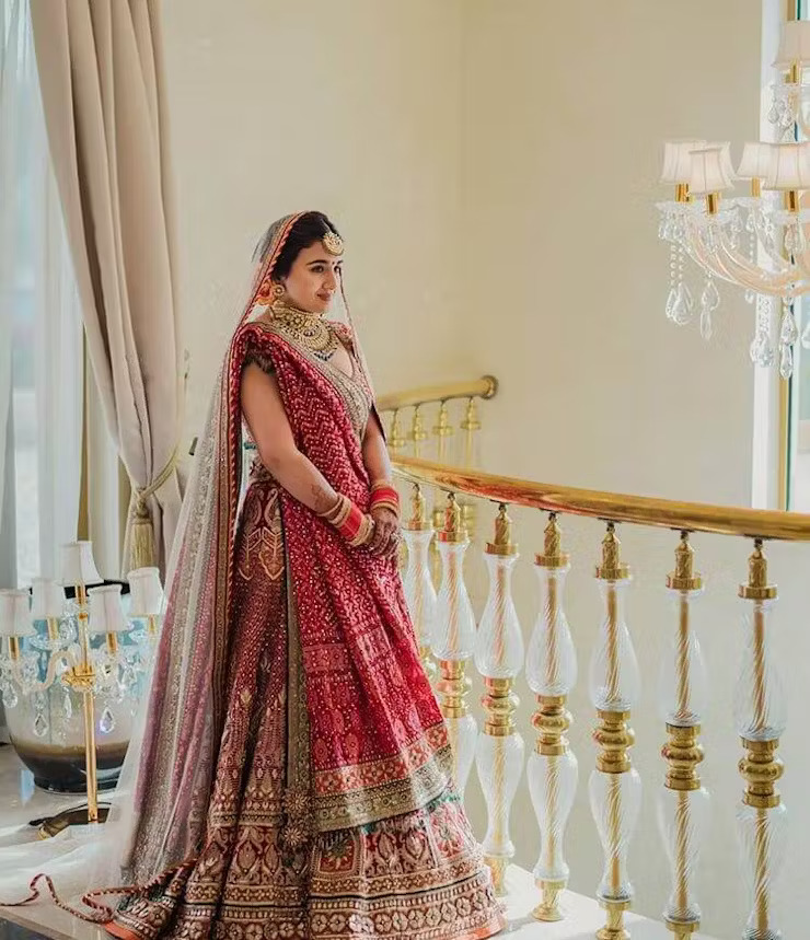 A. When choosing a bridal dupatta, consider whether you want to wear one or two dupattas. Most lehengas come with only one dupatta, so you may need to request a second one from your designer. Decide if you want the dupattas to match the color of your lehenga or if you prefer a contrasting color that complements it.