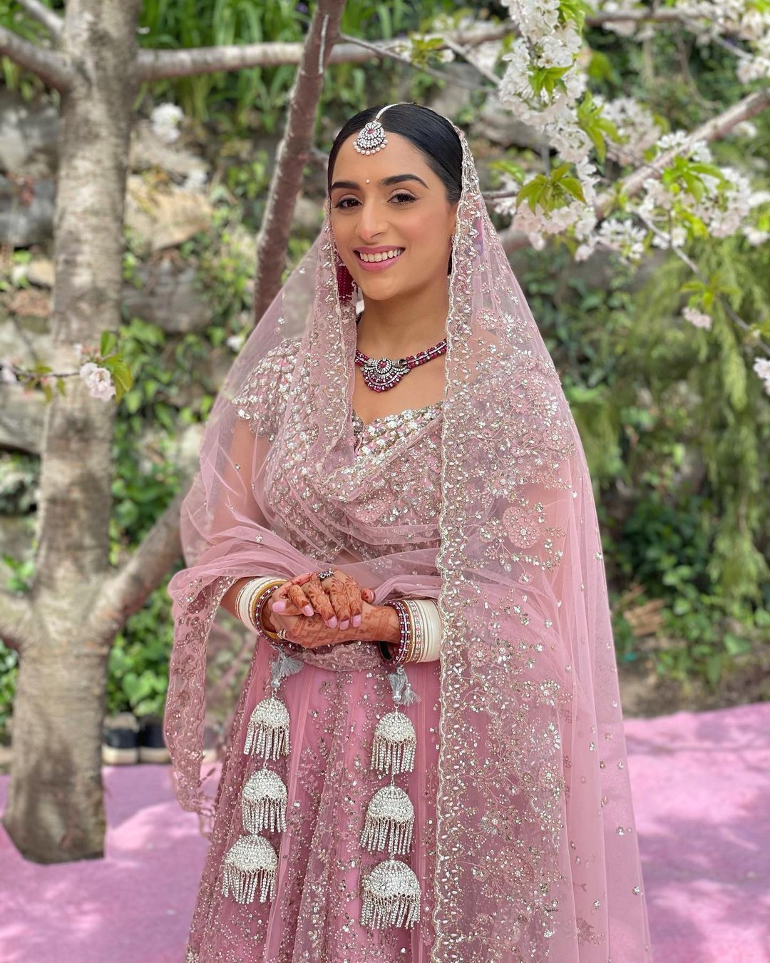 Ideal for pre-wedding events like the sangeet or mehendi, this style involves pinning the dupatta low on the bun and neatly pleating it over one shoulder. This method ensures the dupatta stays in place, allowing the bride to move freely and participate in the festivities. The pleated drape adds a touch of sophistication and is perfect for brides who prefer a more structured look to their dupatta styling.