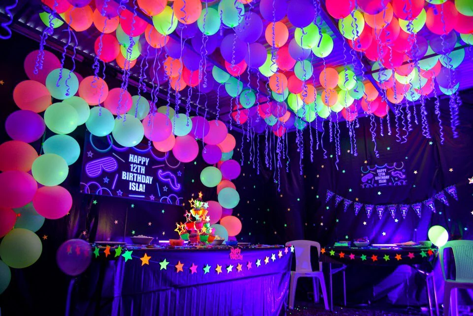 Turn the lights down and the fun up with a glow-in-the-dark theme. Neon decorations, UV face paint, glowing wristbands, and disco lights will make the party pop. A photo booth with neon props will keep Instagram buzzing!
