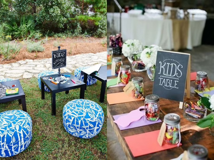 Set up a dedicated activity area at your venue to keep children entertained throughout the celebration. Include coloring books, puzzles, and craft supplies to keep them busy. For an added layer of fun, consider a DIY station where they can create their own wedding-themed crafts, such as decorating mini photo frames or making flower crowns.