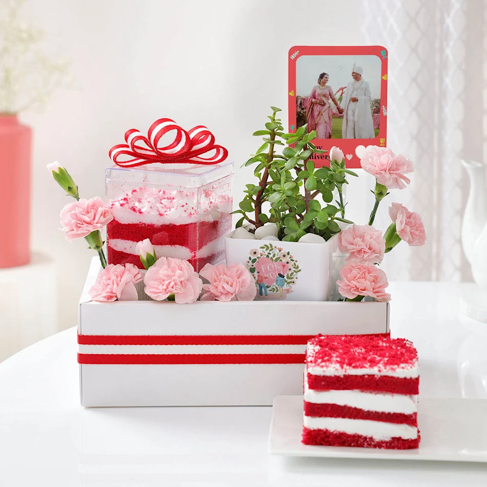 Create a keepsake hamper that tells your story. Include photos from your wedding, love notes, mini souvenirs from trips, and personalized items like engraved mugs or cushions. It’s a nostalgic yet creative way to express your love while celebrating your journey together.
